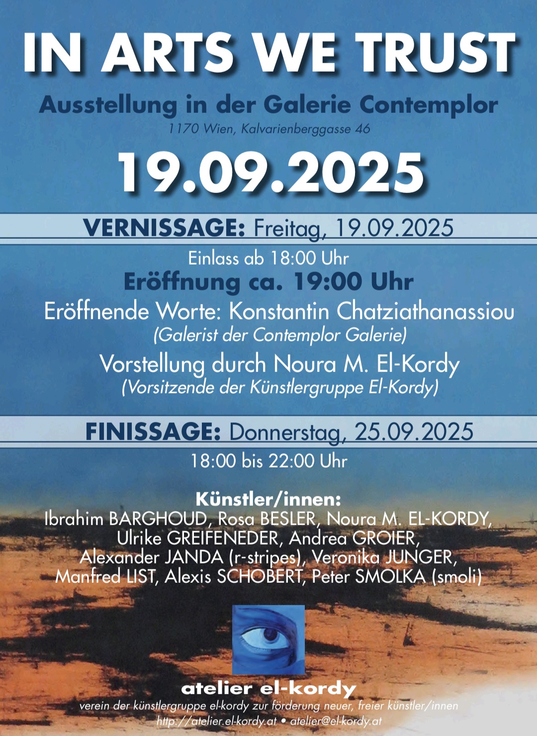 Die Ausstellung der Künstlergruppe "EL KORDY" ist am 19.September 2025, ab 18 Uhr in er Galerie Contemplor (1170 Wien, Kalvarienberggasse 46) zu sehen. Für weitere Infos einfach den Blockeintrag ansehen.