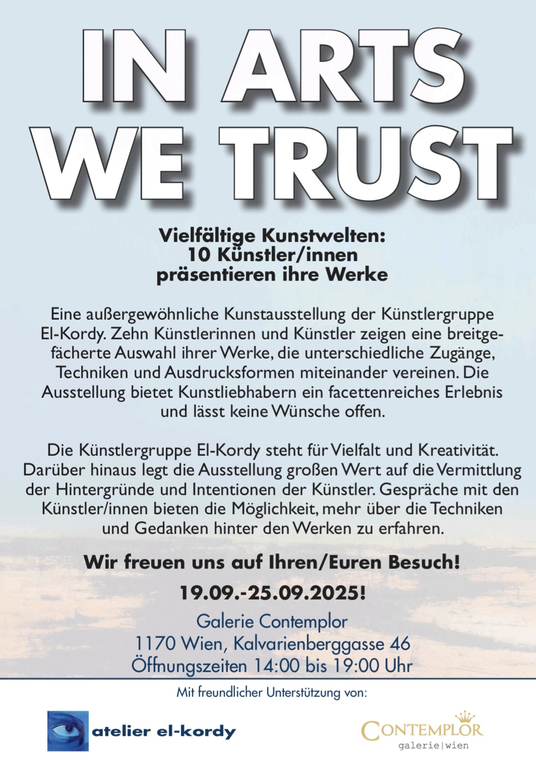 Die Ausstellung der Künstlergruppe "EL KORDY" ist am 19.September 2025, ab 18 Uhr in er Galerie Contemplor (1170 Wien, Kalvarienberggasse 46) zu sehen. Für weitere Infos einfach den Blockeintrag ansehen.