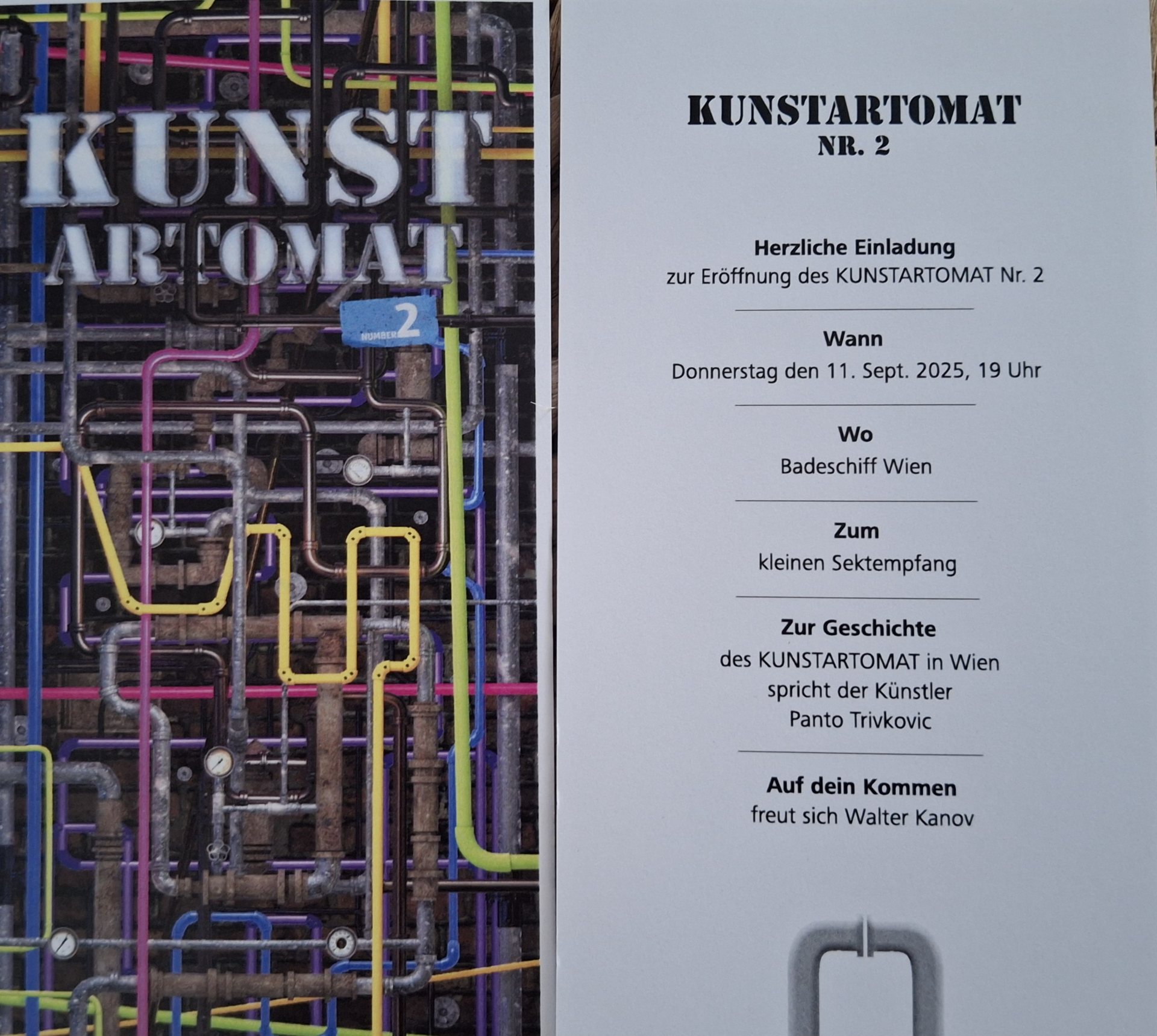 Am Donnerstag, den 11. September 2025, um 19 Uhr wird ein zweiter Kunstartomat am Badeschiff eröffnet. Genießen Sie einen Sektempfang und erleben Sie Kunst in einer außergewöhnlichen Umgebung! Eröffnungsrede: Panto Trivkovic